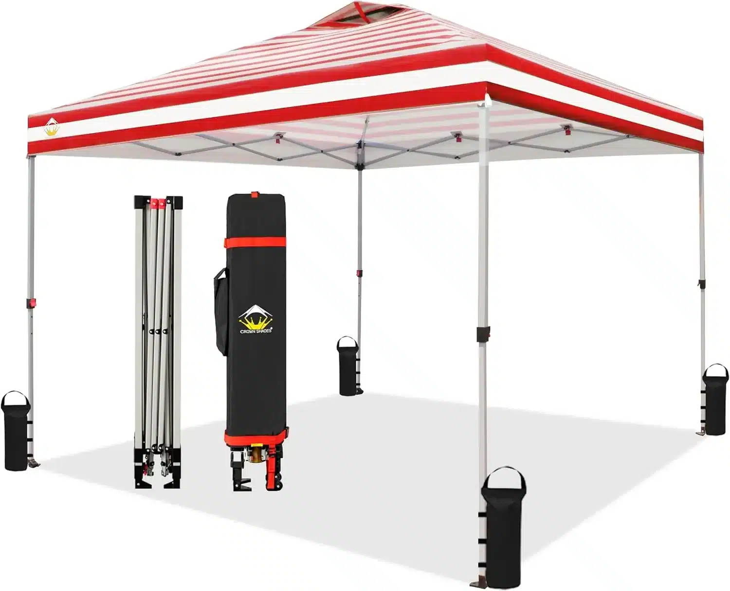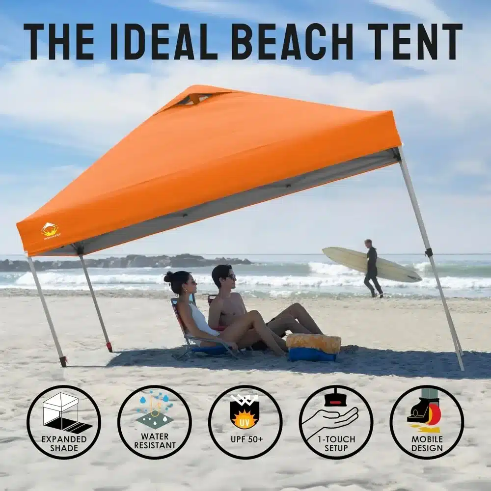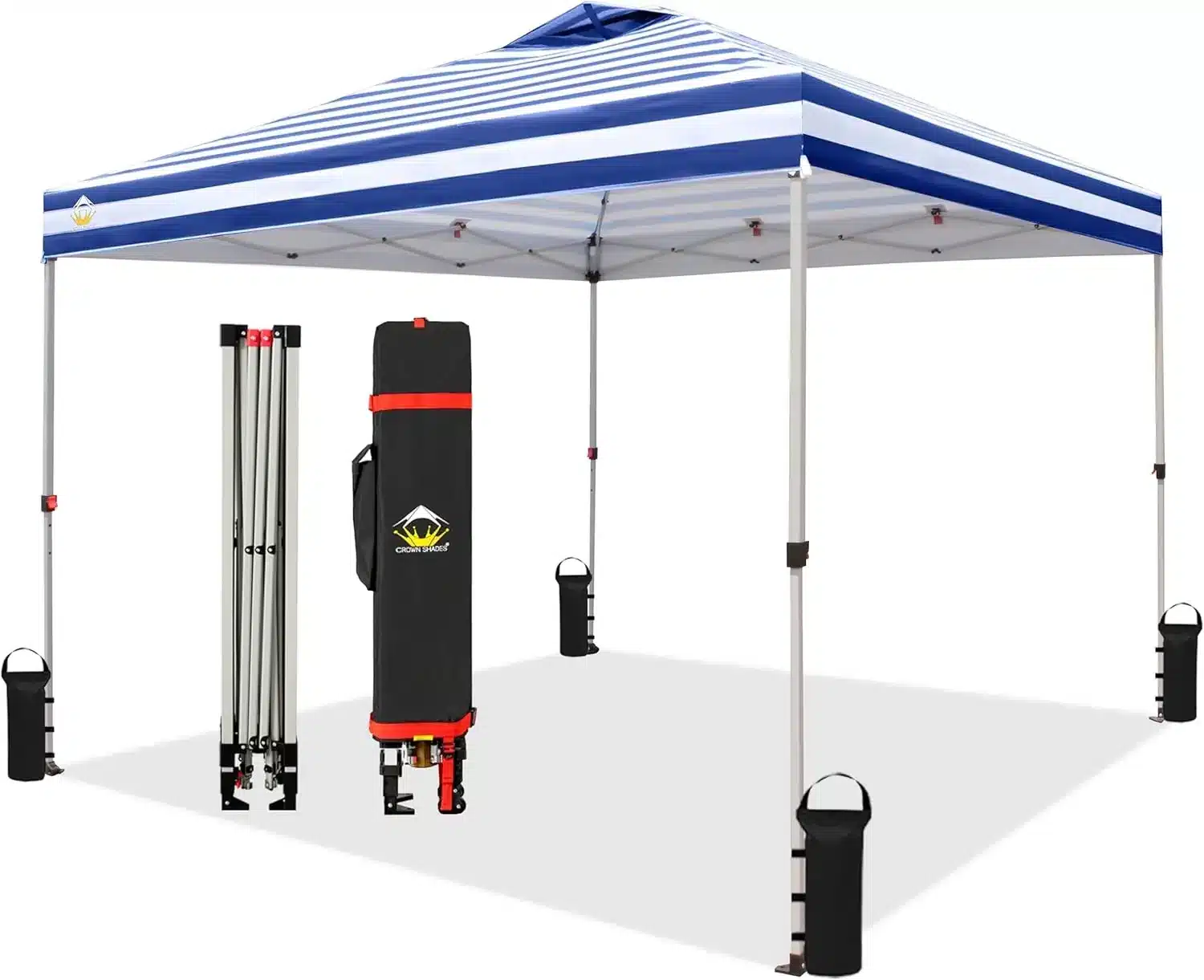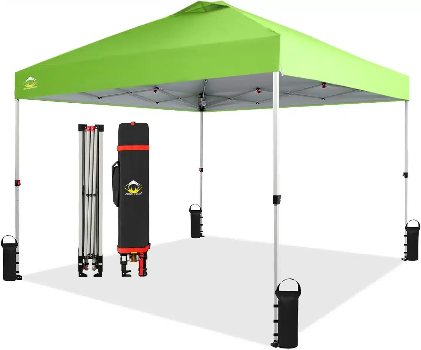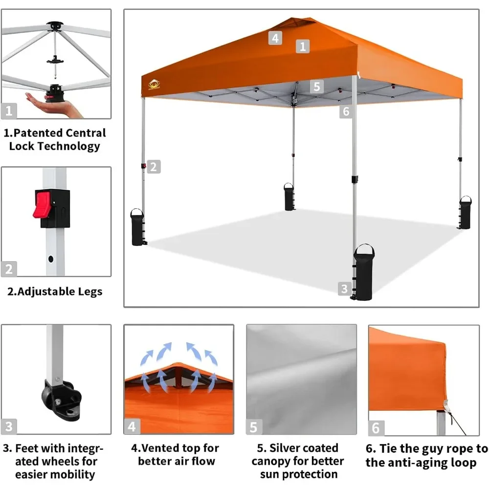 ONE BUTTON EASY SET UP – Our 10×10 pop up canopy tent features patented one push center lock tech. With just a single push, the central hub locks the poles in place. Designed for the next generation, this outdoor canopy for patio can be set up by two people in seconds without any tools. Three adjustable height settings with soft, pinch-free buttons ensure convenience and safety, making it perfect for camping, beach outings, craft fairs, tailgating, farmer markets, outdoor BBQs, and more