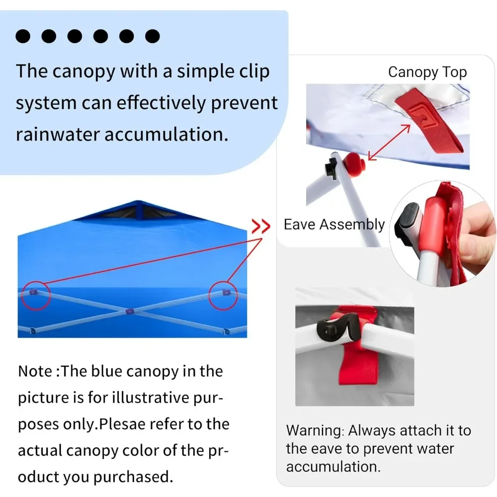 EZ CLIP CANOPY FABRIC – The new clip system easily attaches the canopy fabric to the frame. The silver-coated interior provides UPF 50+ UV protection, ensuring cooler and safer shade. Made from rugged 150D fabric, the pop up tent is water-resistant and flame-resistant (CPAI-84). Integrated air vents and the EZ Clip system prevent wind lift and rain pooling, reducing fabric tearing risks. This innovative design is ideal for outdoor events and gatherings