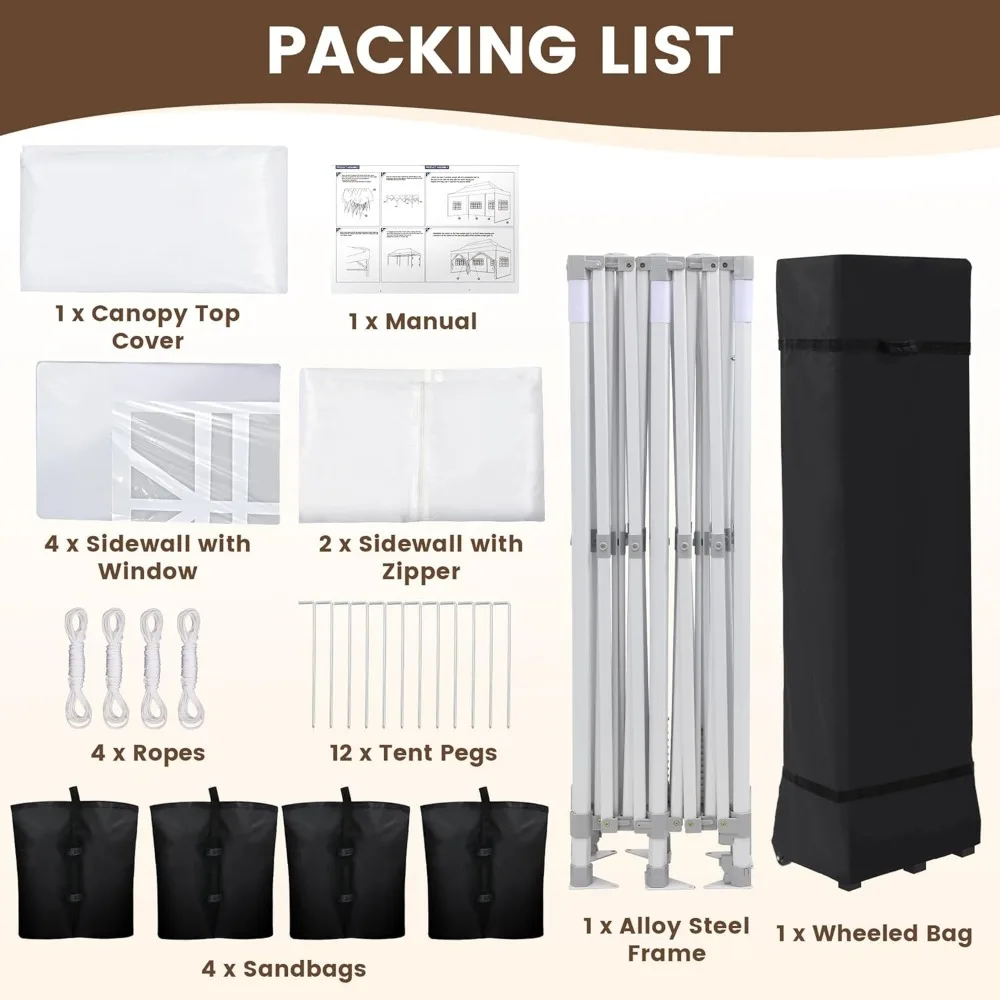- EXTRA ITEMS INCLUDED Every pop up canopy tent includes a storage bag with all terrain wheels. The bag also makes storage easy and convenient with a minimum of space required. We also include 4 large sandbags which will help you secure the corners in the event of a windy day. Additionally, all our pop up canopy tents include 12 heavy duty ground stakes for additional safety, as well as 4 tie-down ropes for the corners