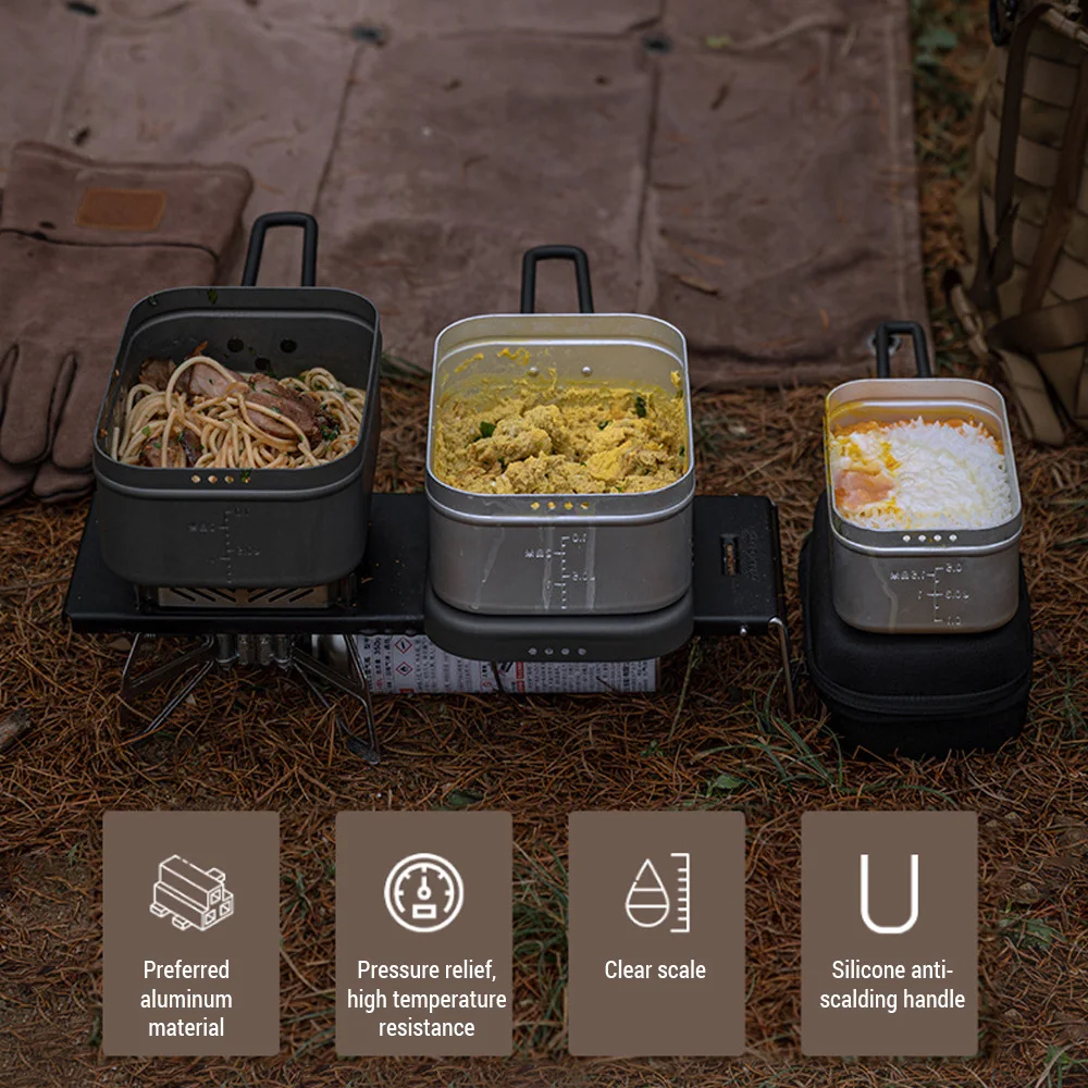This pressure relief lunch box is made of high-quality aluminum, which is heat-resistant and conducts heat quickly. The box body is thickened to resist wear and corrosion, making it durable. The four-point round hole design effectively prevents excessive steam and pressure buildup. The silicone anti-scold handle is easy to open and convenient to carry.