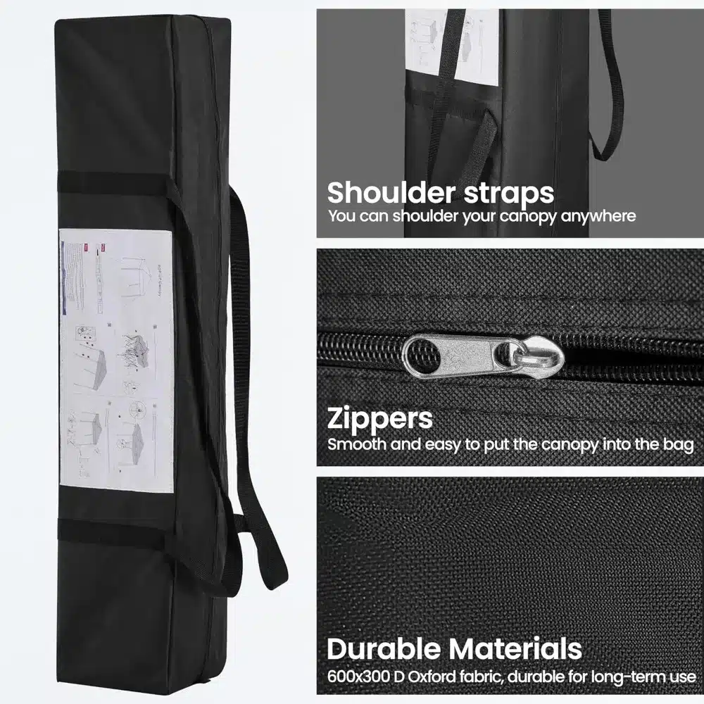 Portable Storage Bag: The included 8.3″ L × 8″ W × 41″ H carry bag makes it easy to store and transport the pop-up canopy tent to your next camping trip, BBQ, or outdoor adventure