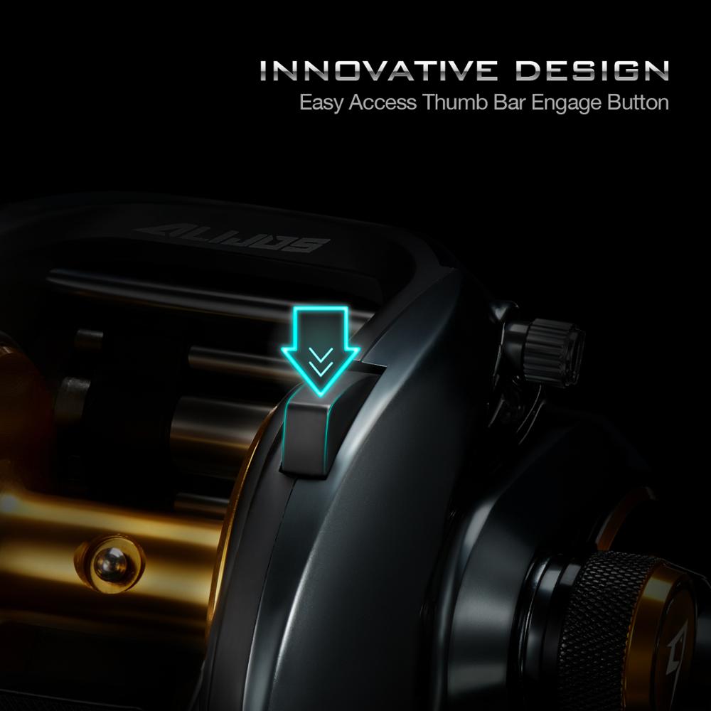 5. Ergonomic and Innovative – Piscifun Alijoz 300 baitcasting reel comes with a super easy to access thumb bar engage button on the gear side plate which helps you bump back the thumb bar without cranking the handle. The super sturdy line wrap spool eliminates using mono as backing. Double shafts support line guide system greatly increases the stability and durability. 8 effective magnetic braking system prevents overruns and backlash. Inner wrapped thumb bar pad give you better comfort.